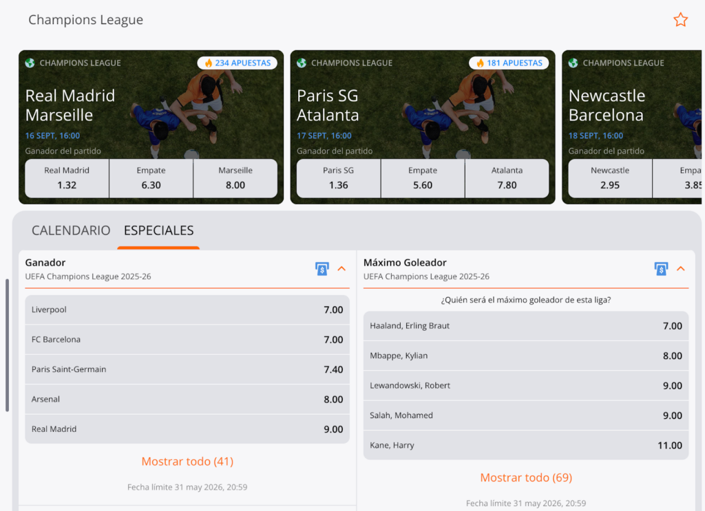 En Betsson Argentina, las apuestas a largo plazo se encuentran en la sección “Especiales” dentro de cada torneo o competición disponible en la plataforma. Por ejemplo, así se ven las opciones de jugadas a futuro para la Champions League: